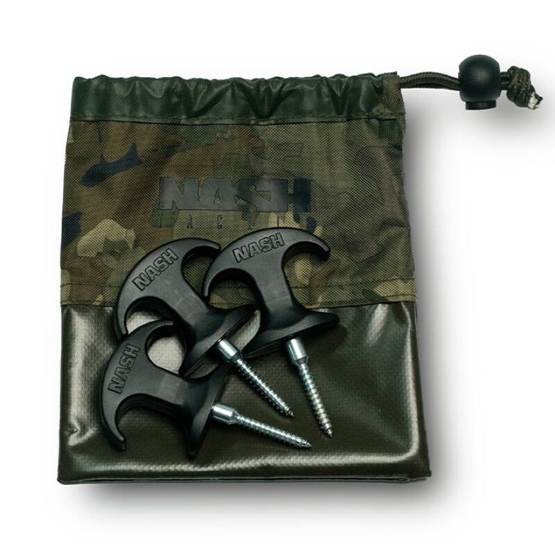 Każda szpilka wyposażona jest w wyprofilowany uchwyt w kształcie litery T, który ułatwia ich wkręcanie i wykręcanie po zakończonej zasiadce. W zestawie znajduje się 15 szpilek, co pozwala na mocne i pewne zamocowanie większych konstrukcji. Co więcej, komplet ten jest dostarczany w wytrzymałym woreczku Nash z kamuflażowym wzorem, co ułatwia jego transport i przechowywanie.