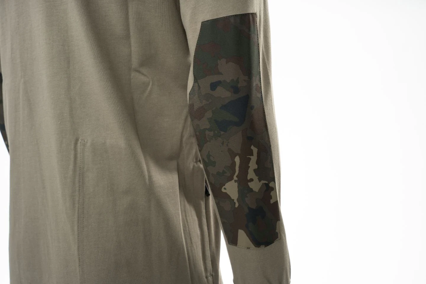 Wodoodporne łaty na łokciach z kamuflażowym wykończeniem, kieszeń Tech Protect z na telefon lub odbiornik oraz ukryta kieszeń na suwak w bocznym szwie idealna na klucze sprawiają, że koszulka łączy styl z funkcjonalnością. Łatwo się składa i pakuje, dzięki czemu bez problemu zmieści się w plecaku lub torbie.