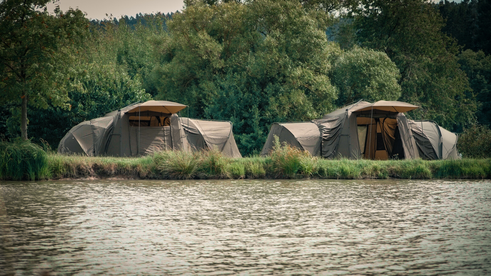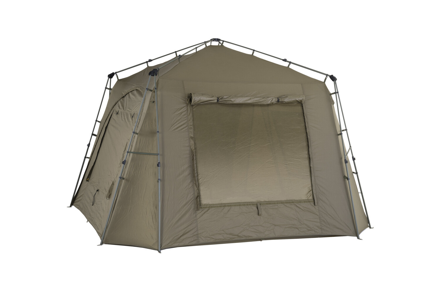 Mivardi Base Camp XL to duży, wytrzymały i idealnie stabilny namiot, dopracowany w najdrobniejszych szczegółach, a jednocześnie szybki i łatwy w montażu. Oferuje on znacznie więcej niż tylko dużą przestrzeń, drzwi i okna. Jego sercem jest wyjątkowo stabilna rama z podwójnymi nogami podporowymi połączonymi krótkimi prętami napinającymi z solidnymi klipsami na obu końcach. Znacznie wzmacniają one konstrukcję i zmniejszają ryzyko wygięcia. Dwa z prętów napinających posiadają praktyczne uchwyty na wędki z rzepem. Wszystkie główne sekcje ramy są teleskopowe i wyposażone w niezawodny system blokowania, ułatwiający regulację. Teleskopowa konstrukcja pozwala również na kompaktowy rozmiar transportowy oraz szybki i wygodny montaż i demontaż. W ekstremalnych warunkach stabilność namiotu można dodatkowo zwiększyć za pomocą czterech lin. Cały montaż lub demontaż może być z łatwością przeprowadzony przez jedną osobę. Zewnętrzna powłoka wykonana jest z materiału M-TEC300 o heksagonalnej fakturze, charakteryzującego się wodoodpornością na poziomie 8000 mm i zwiększoną odpornością mechaniczną. Ściana przednia składa się z otwieranego panelu wejściowego z dużym oknem, wyposażonym w moskitierę, przezroczyste PCV i nylonową osłonę. Przedni panel w stylu skrzynki na listy można otwierać z boku i zwijać tradycyjnie lub częściowo rozsuwać od góry do dołu, aby otwierać go stopniowo. Z przodu znajduje się duży daszek z własną ramą z włókna szklanego. Po rozłożeniu jest on podparty dwoma słupkami i zabezpieczony linkami odciągowymi. Daszek można całkowicie złożyć wzdłuż przedniej ściany bez konieczności całkowitego demontażu. Specjalnie zaprojektowane połączenie daszka z głównym zadaszeniem skutecznie zapobiega gromadzeniu się wody na dachu, nawet podczas ulewnych deszczy. Na tylnej ścianie znajduje się duże okno z moskitierą, okno nylonowe oraz przezroczyste okno z PVC, do którego można przymocować rzepy. Daszek jest również wyposażony w funkcję mikrowentylacji po zastosowaniu przekładki w dolnej części okna. Przednia ściana składa się z otwieranego panelu wejściowego z dużym oknem, wyposażonym w moskitierę i okno nylonowe. Ściany boczne zadaszenia wyposażone są w duże okna z nylonowymi osłonami i moskitierą, również z funkcją mikrowentylacji. Boczne panele w stylu skrzynki na listy można również częściowo otworzyć lub całkowicie zdemontować. Unikalną cechą namiotu Mivardi Base Camp jest oddzielnie dostępny zestaw do mocowania namiotu. Zestaw zawiera dwa uniwersalne pokrowce boczne, które można przymocować do namiotu zamiast paneli bocznych, umożliwiając podłączenie niemal każdego namiotu lub brolly do namiotu Base Camp. Inne opcjonalne akcesoria to zestaw czterech wewnętrznych organizerów do zawieszania oraz wytrzymała, trwała podłoga. Namiot jest dostarczany w obszernej torbie transportowej, która ułatwia pakowanie. Torba wykonana z nylonu 600D jest wodoodporna i łatwa w czyszczeniu.